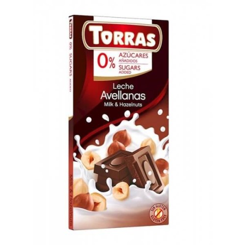 Czekolada mleczna z orzechami laskowymi Torras bez dodatku cukru wyprodukowana w Hiszpanii, będąca doskonałym wyborem dla osób, które unikają cukru oraz glutenu w diecie, a nie chcą rezygnować z ulubionych słodyczy. Ta wysokiej jakości mleczna czekolada z dodatkiem rozdrobnionych orzechów, zawiera minimum 34% masy kakaowej i wyróżnia się delikatnym, mlecznym smakiem i przyjemną chrupkością.